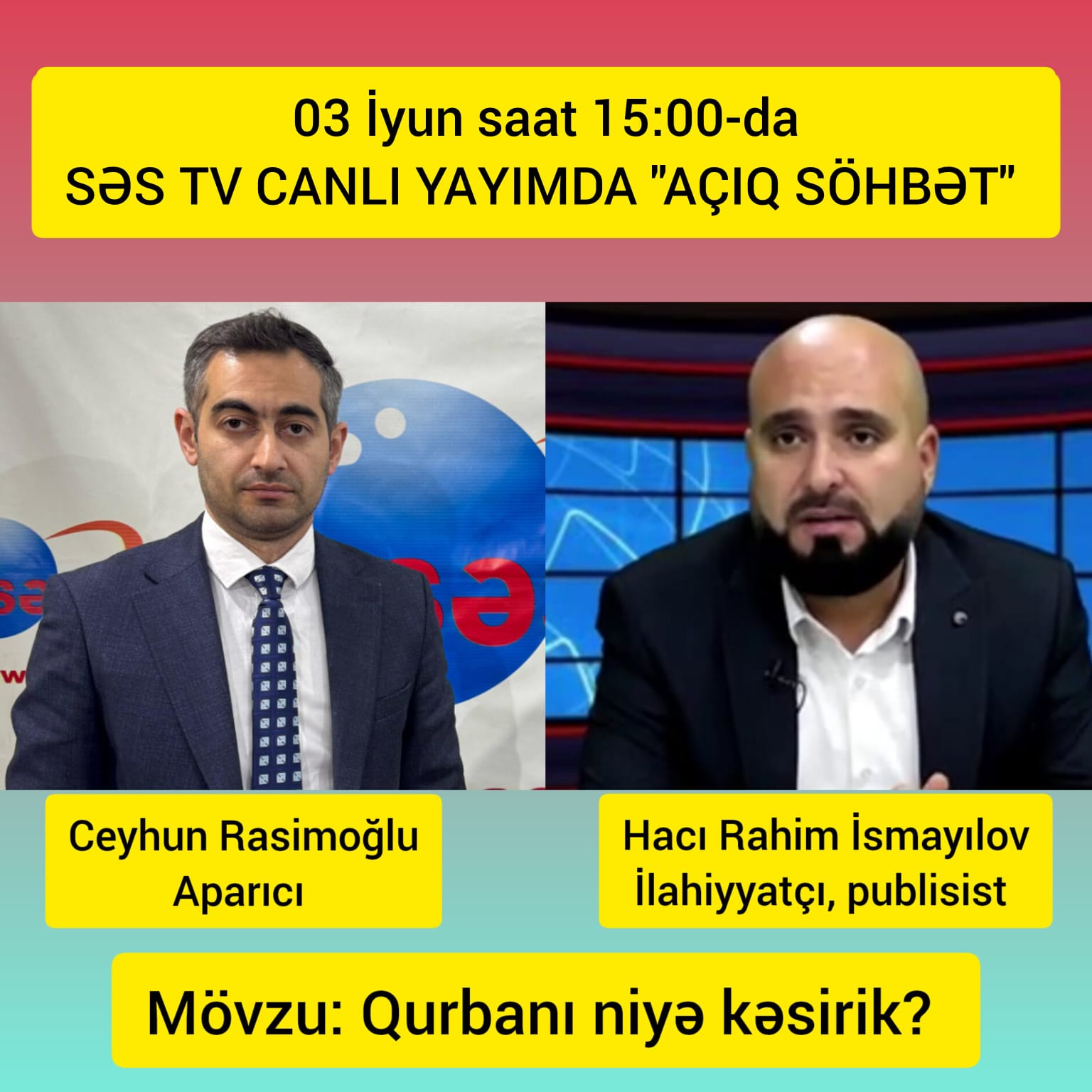 Araşdırmaçı Publisist İlahiyyatçı Hacı Rahim,Səs Tv nin efirində Ceyhun Rasimoğlunun “AÇIQ SÖHBƏT” verlişində canlı debadta olacaq izləməyi unutmayın