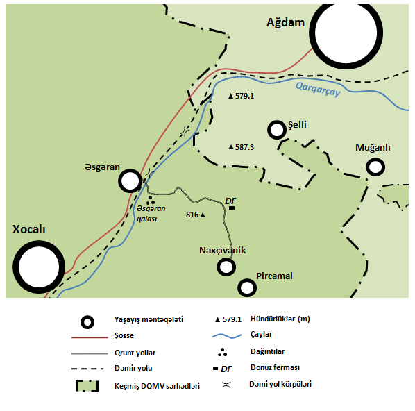 - Şəhərin şərq hissəsindən çay yatağı boyunca şimal-şərq istiqamətinə, Əsgəranı sol tərəfdə saxlamaqla (Ermənistan rəsmiləri məhz bu yolun “azad dəhliz” kimi saxlanıldığını bildirir);